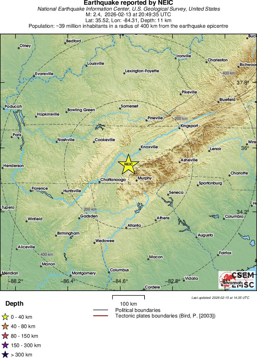 | 2.4 | 11.4 | 7895 | 21:49 | Link | Minor Earthquake - EASTERN TENNESSEE - Yesterday |