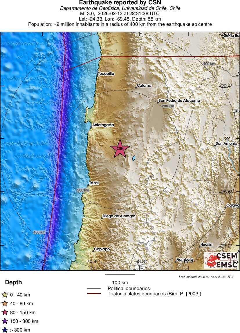 | 3 | 85.1 | 11756 | 23:31 | Link | Minor Earthquake - ANTOFAGASTA, CHILE - Yesterday |