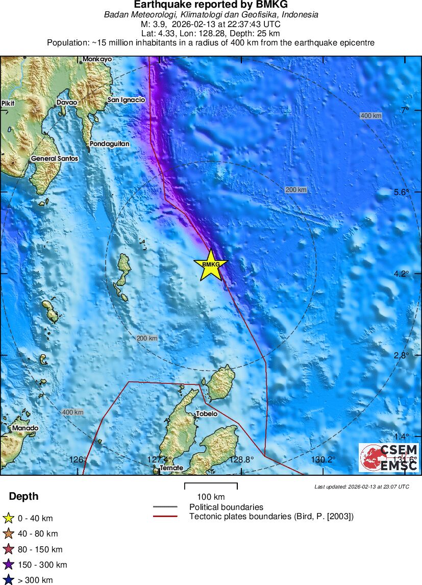 | 3.9 | 25 | 11183 | 23:37 | Link | Minor Earthquake - NORTH OF HALMAHERA, INDONESIA - Yesterday |