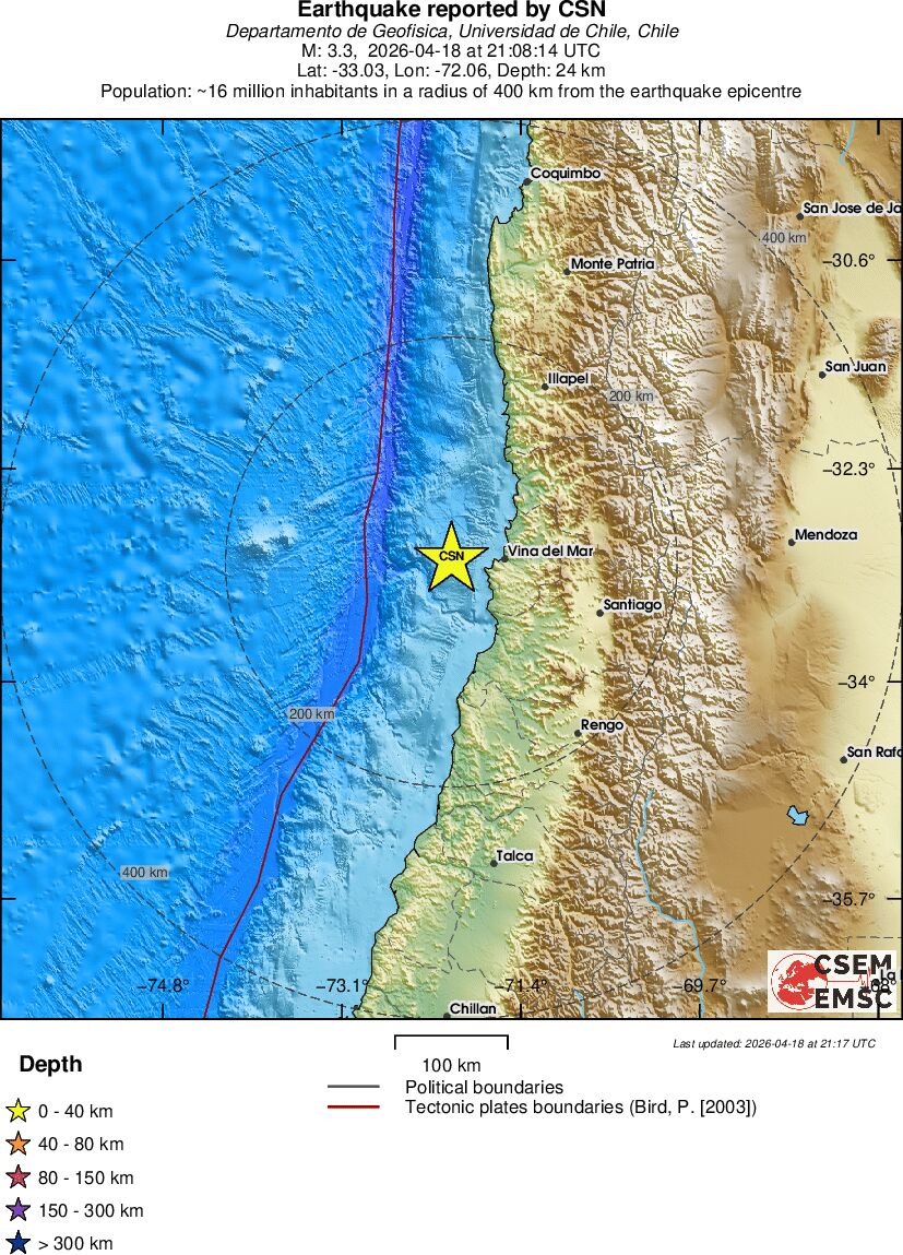 | 3.3 | 23.6 | 7841 | 23:08 | Enlace | Terremoto pequeño - OFFSHORE VALPARAISO, CHILE - Ayer |
