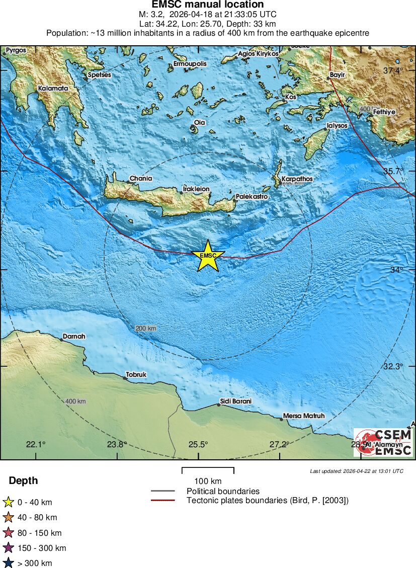| 3.3 | 13.9 | 1063 | 23:33 | Enlace | Terremoto pequeño - CRETE, GREECE - Ayer |