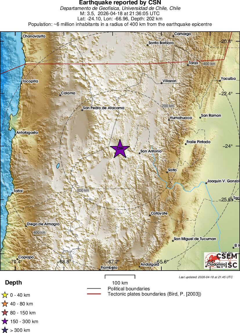 | 3.5 | 201.8 | 7186 | 23:36 | Enlace | Terremoto pequeño - SALTA, ARGENTINA - Ayer |