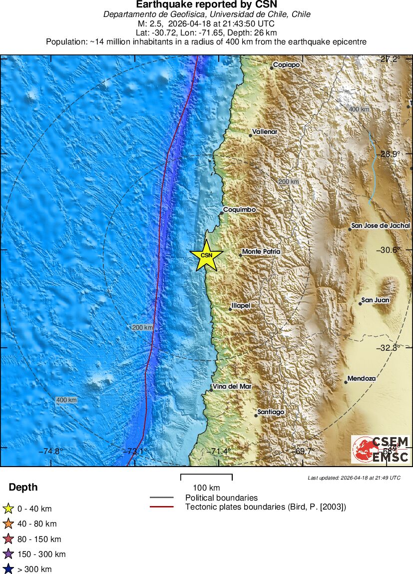 | 2.5 | 26.3 | 7714 | 23:43 | Enlace | Terremoto pequeño - COQUIMBO, CHILE - Ayer |