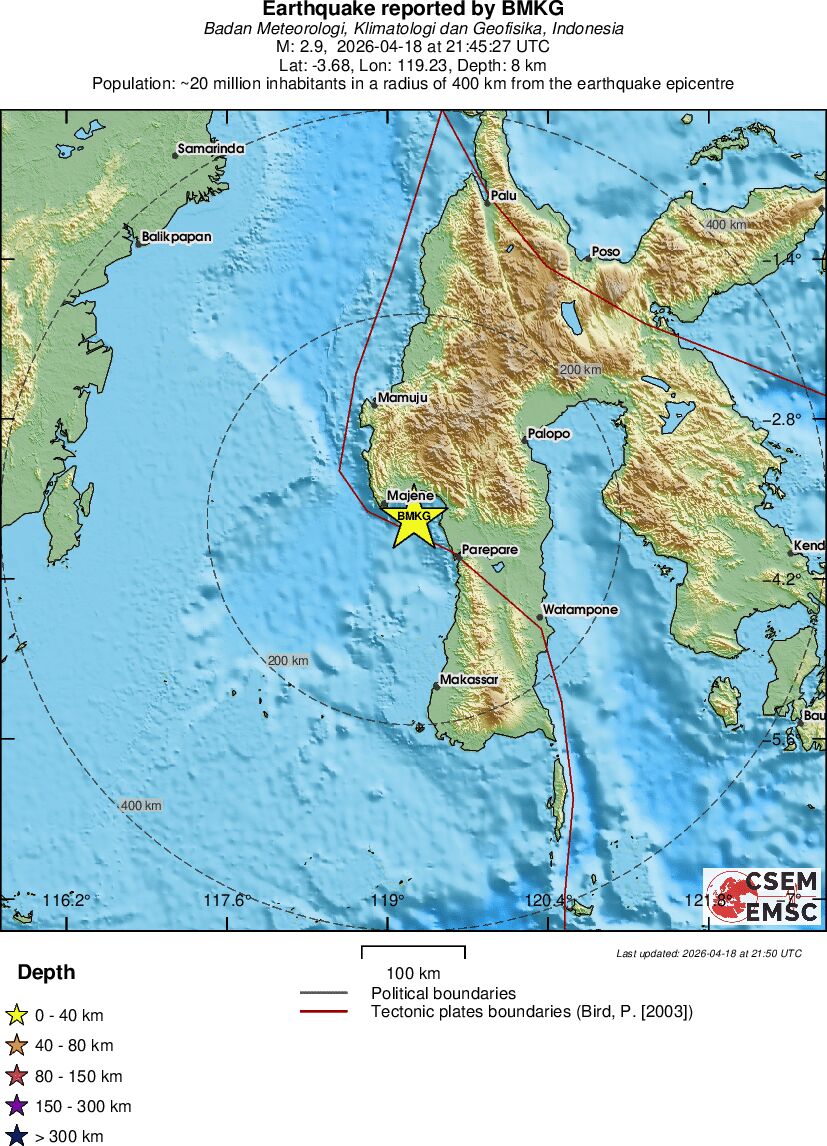 | 2.9 | 8 | 6964 | 23:45 | Enlace | Terremoto pequeño - SULAWESI, INDONESIA - Ayer |