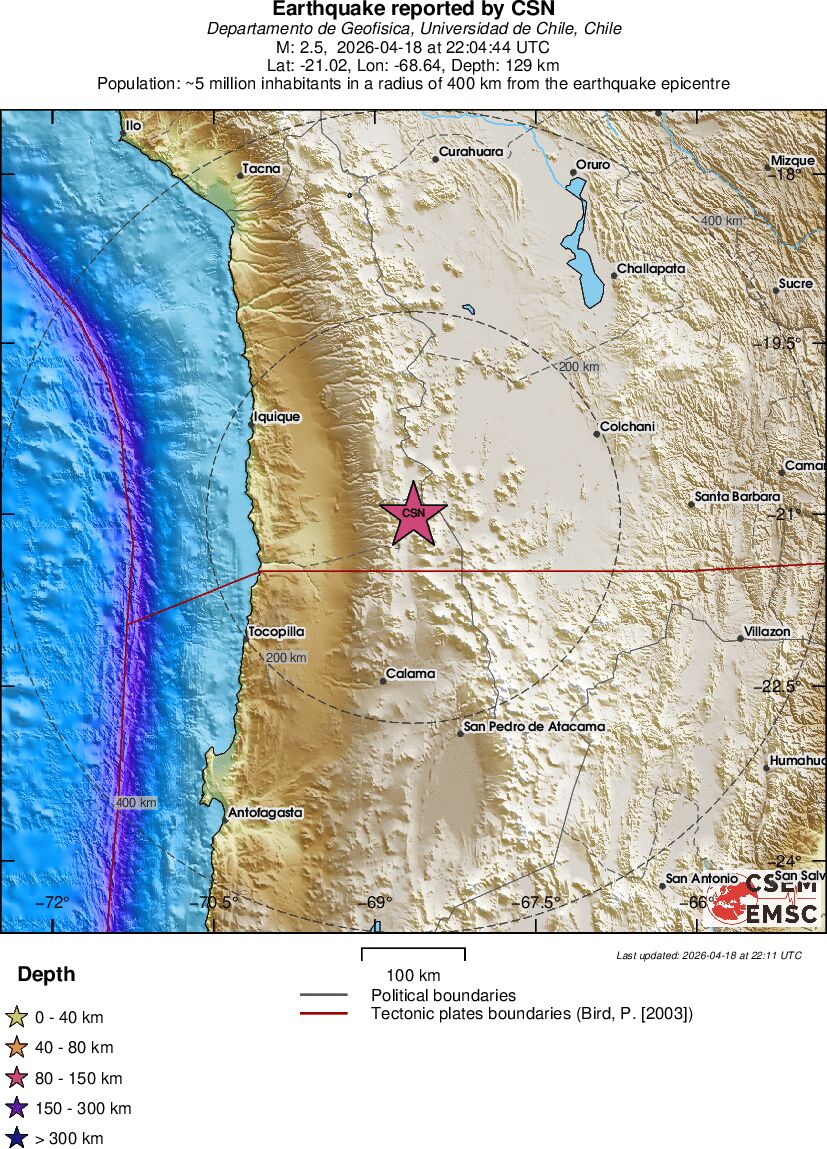 | 2.5 | 128.8 | 7103 | 00:04 | Enlace | Terremoto pequeño - ANTOFAGASTA, CHILE - Hoy |