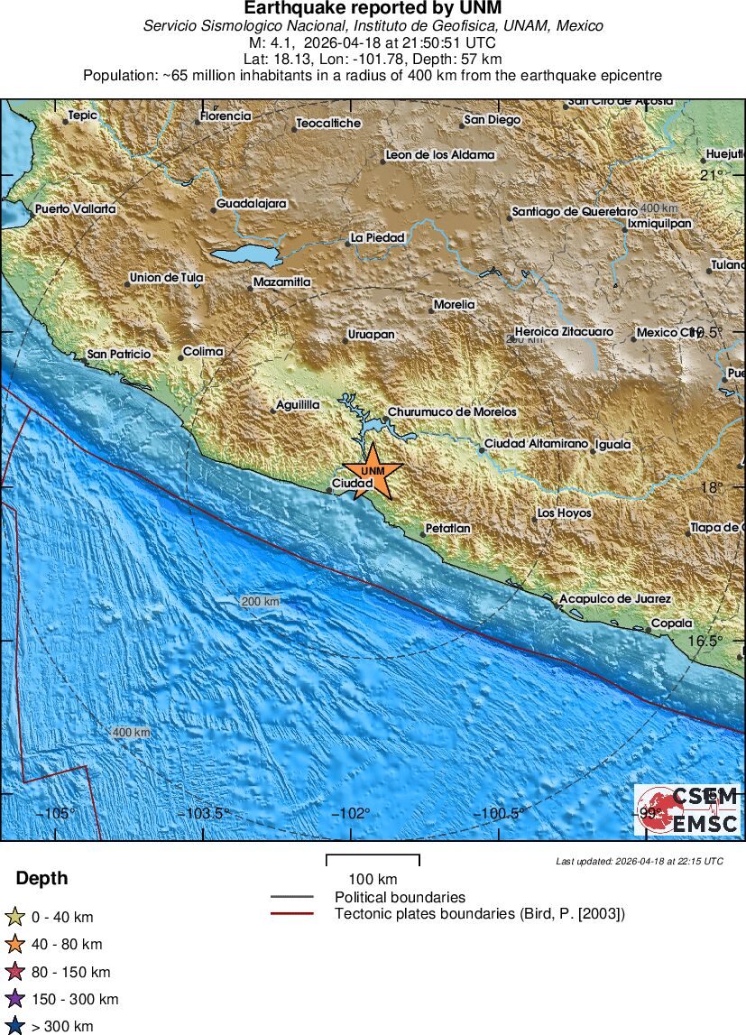 | 4.1 | 57.1 | 6513 | 23:50 | Enlace | Terremoto ligero - GUERRERO, MEXICO - Ayer |