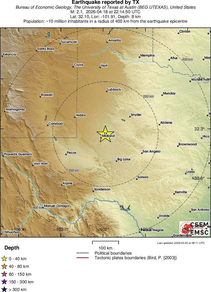| 2.1 | 4.7 | 5833 | 01:04 | Enlace | Terremoto pequeño - WESTERN TEXAS - Hoy |