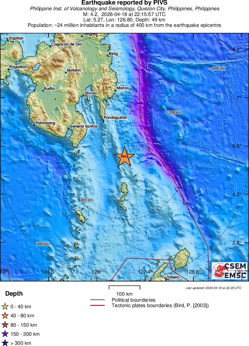 | 4.2 | 49 | 6834 | 00:15 | Enlace | Terremoto ligero - MINDANAO, PHILIPPINES - Hoy |