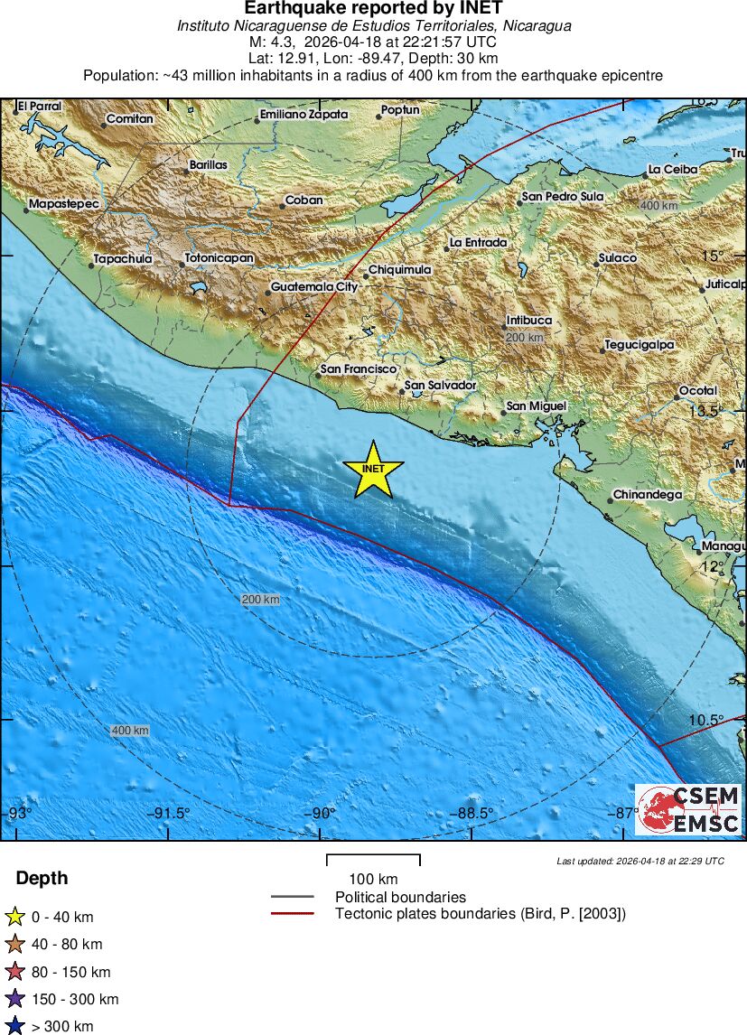 | 4.3 | 30 | 6294 | 00:21 | Enlace | Terremoto ligero - OFFSHORE EL SALVADOR - Hoy |