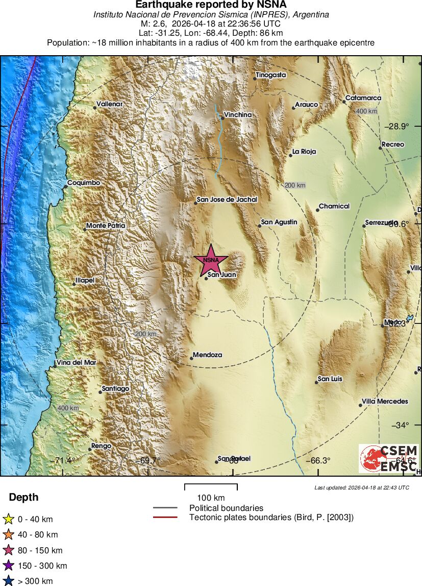 | 2.6 | 86 | 7604 | 00:36 | Enlace | Terremoto pequeño - SAN JUAN, ARGENTINA - Hoy |