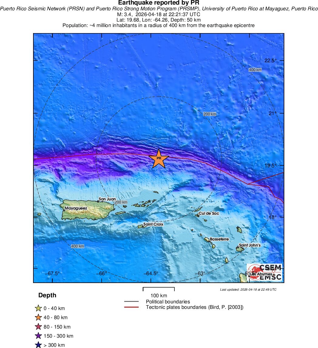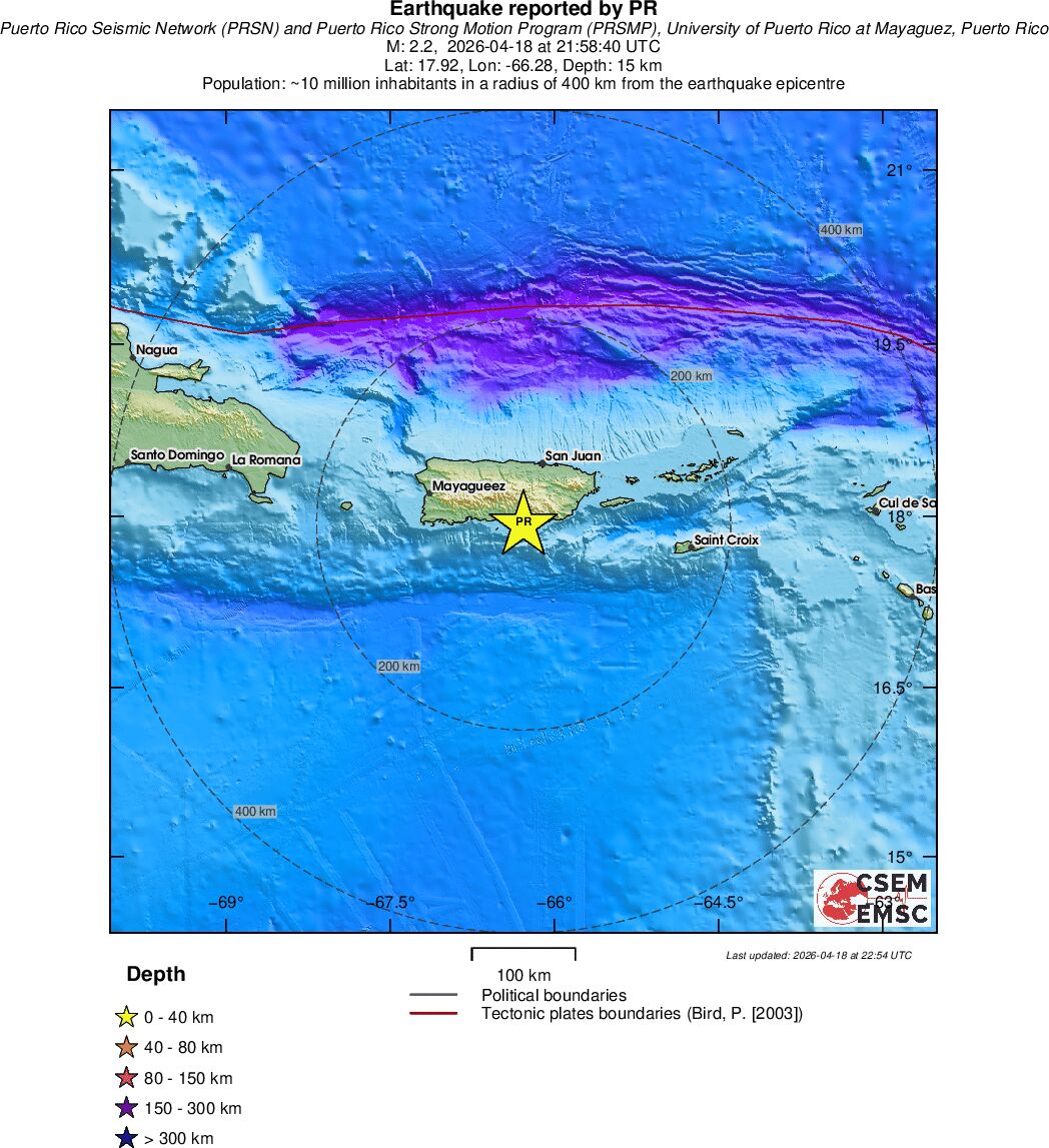 | 2.2 | 15.3 | 5003 | 23:58 | Enlace | Terremoto pequeño - PUERTO RICO REGION - Ayer |