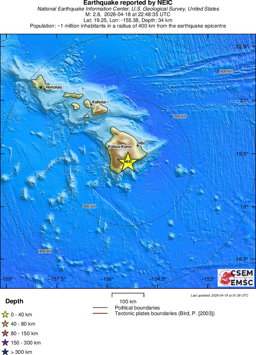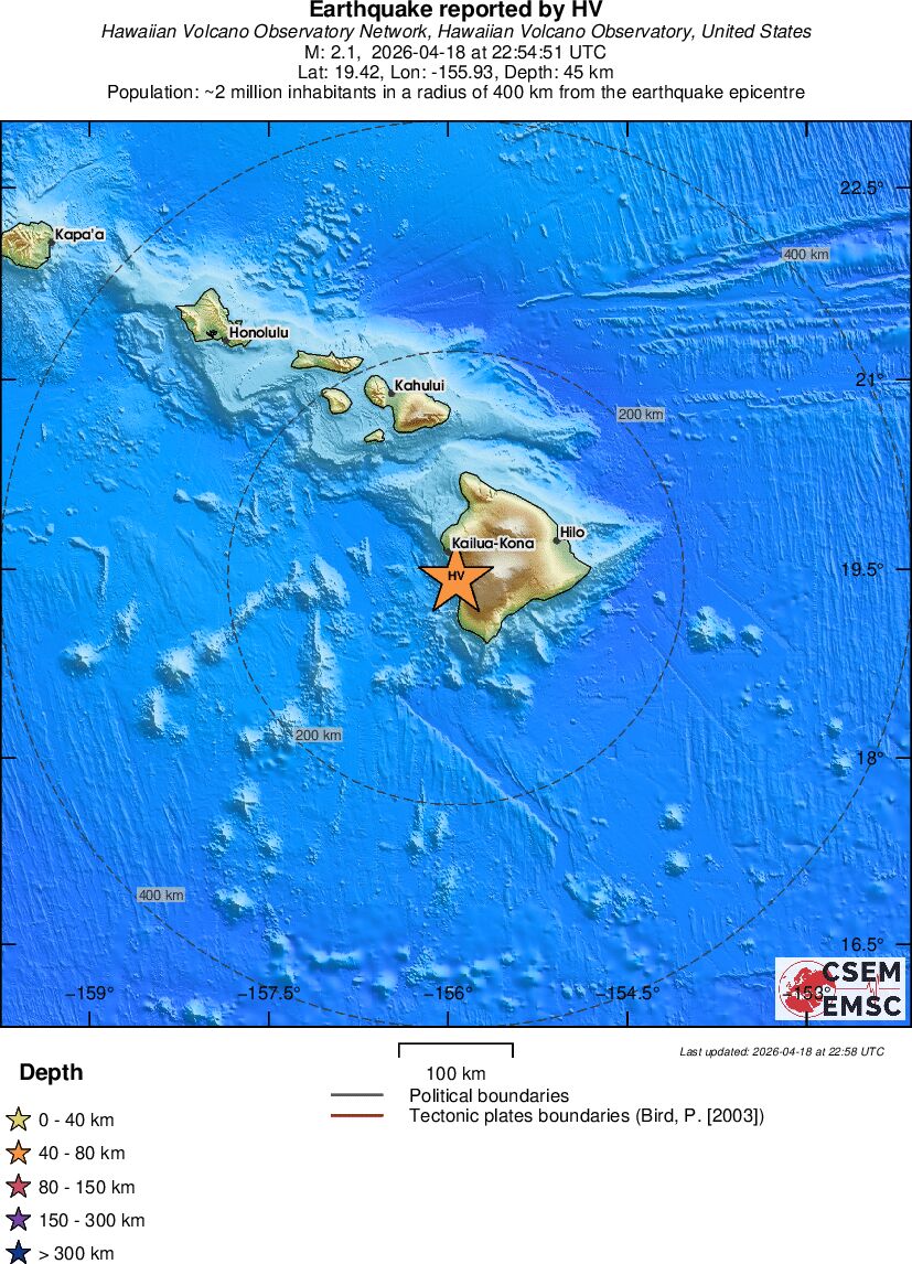 | 2.1 | 45.4 | 7744 | 00:54 | Enlace | Terremoto pequeño - ISLAND OF HAWAII, HAWAII - Hoy |