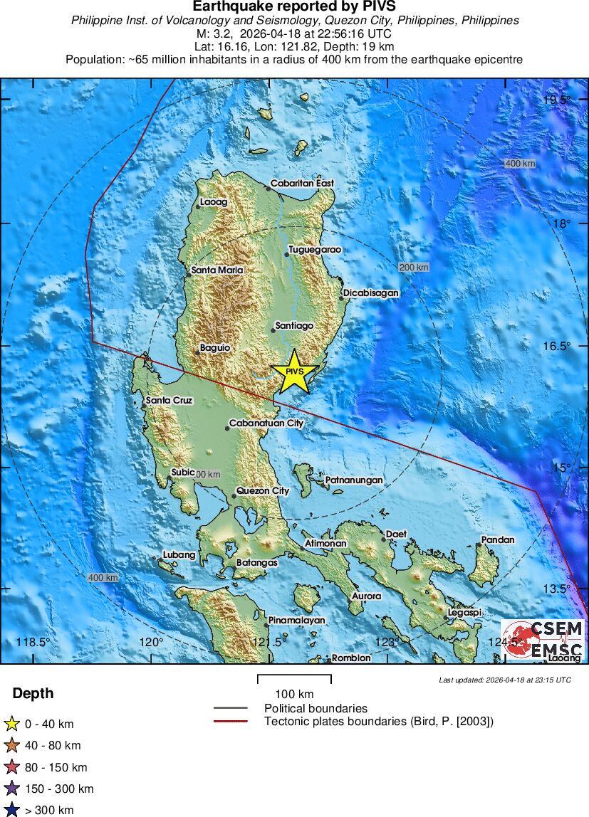 | 3.2 | 19 | 6039 | 00:56 | Enlace | Terremoto pequeño - LUZON, PHILIPPINES - Hoy |