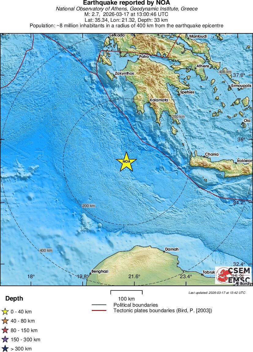 | 2.7 | 33.4 | 1471 | 14:00 | Linky | Slabšie zemetrasenie - CENTRAL MEDITERRANEAN SEA - Dnes |