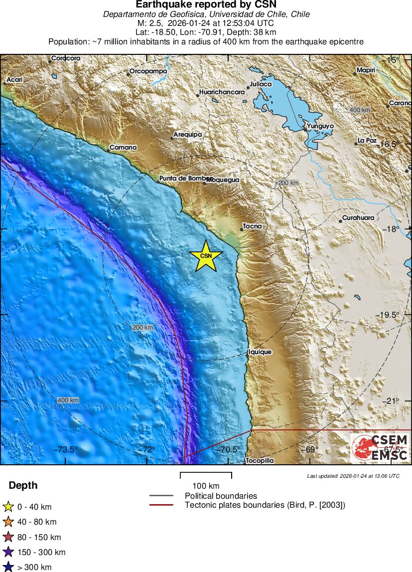 | 2.5 | 37.9 | 11388 | 13:53 | Linky | Slabšie zemetrasenie - OFFSHORE TARAPACA, CHILE - Dnes |